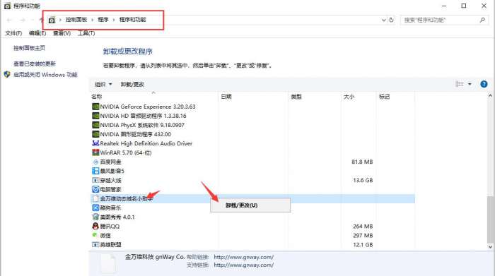 方法一:打开电脑控制面板>>程序>>程序和功能,在程序和功能面板中找到金万维动态域名小助手软件,右键点击“卸载即可