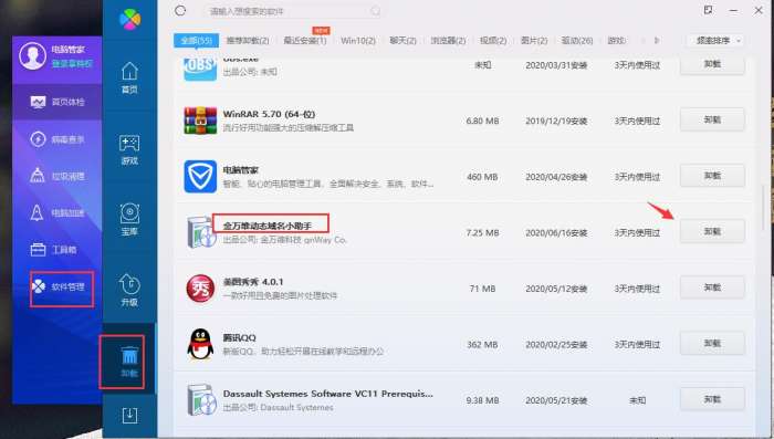 方法二:安装并打开电脑管家软件,选择进入软件管理选项,点击卸载选项,在列表中找到金万维动态域名小助手软件,点击卸载即可