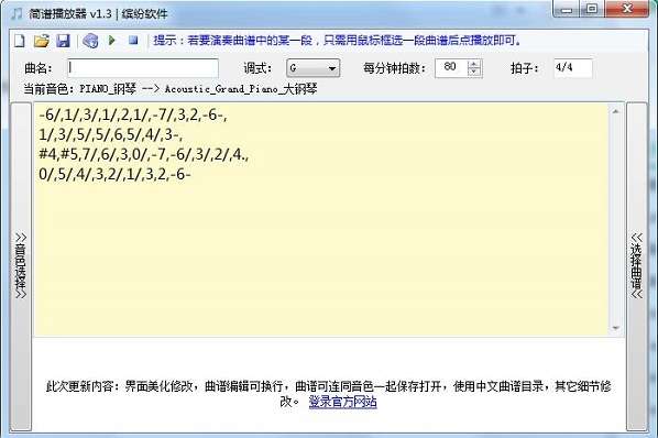 缤纷简谱播放器官方版是一款界面简洁的简谱打谱软件,缤纷简谱播放器中文版主要能够播放出128种不同的乐器弹奏,其播放不需要任何音频文件,只需输入简谱便能实现,缤纷简谱播放器官方版可设置用调式,如G调、C调等;可设置拍子,如2/4拍、4/4拍;还能设置速度等功能。