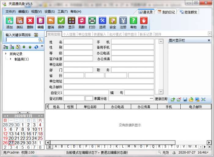 天涯通讯录是一款绝对专业的个人通讯信息管理软件。它具有漂亮时尚的外观,操作灵活方便,上手快。异常丰富的联系人信息与海量的联系人记录,全方位快速查找,支持拼音首字母速查,丰富的窗口以便灵活查看记录的信息,以及独有的名片查看方式。还有嵌入式的手机号码归属地查询,可以快捷地查询到此联系人手机的所在地。强大的导入导出功能可以快速的导入Excel文件及csv文件,可以轻松完成信息的录入。本软件还有一项实用的功能就是图片链接及查看功能,使得记录可以图文并茂。真正做到联系人资料的全面性。天涯通讯录是各界人士必备的信息管理与交流工具。