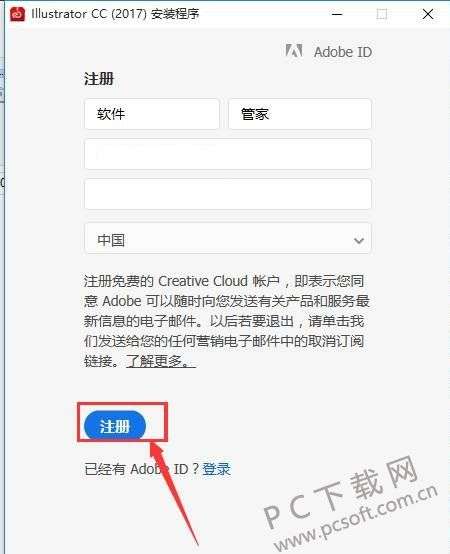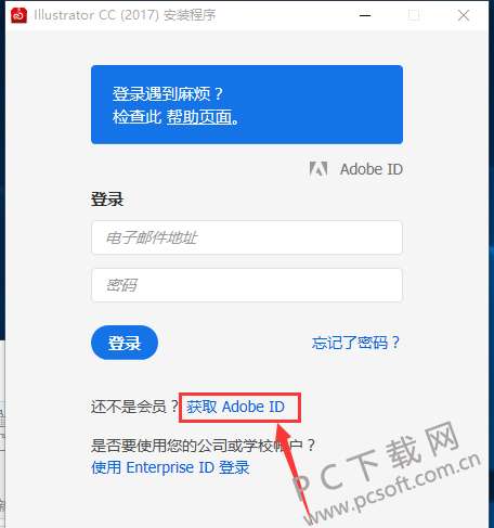 3、首次使用,安装的时候我们需要注册一个账号,点击“获取Adobe ID”;已经有账号的用户可以直接登陆。