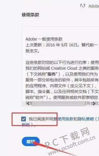 5、勾选使用条款,点击继续。