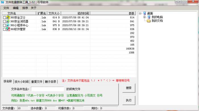 3、点击文件名包含输入文件字符,点击搜索可以搜索包含字符文件,点击勾选文件然后点击执行即可进行文件删除