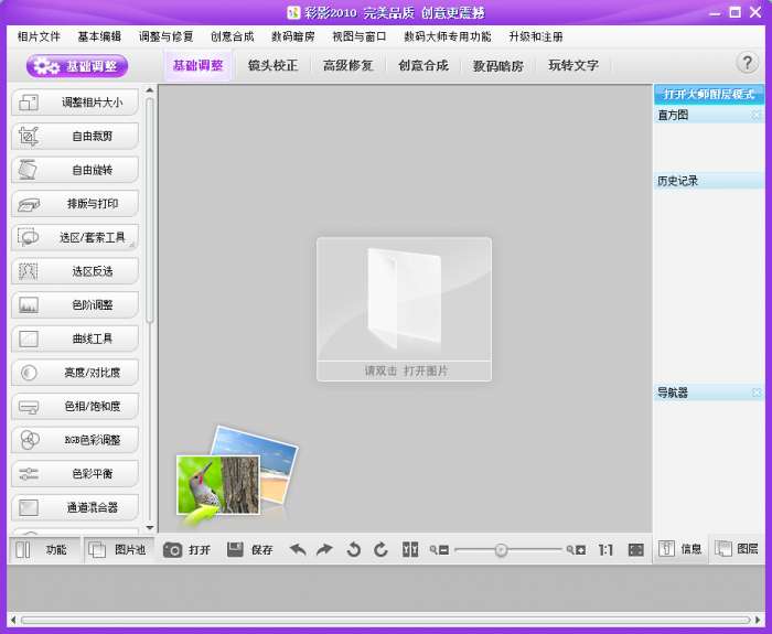 彩影2010是非国际功用最强大、运用最人性化全新一代的高画质、高速度数字图像处置操作系统,让您无需专业的图像处置技艺即可制造出绚丽的一级业余数码照片成效,让争你紧张体验数码图像处置的有限魅力。彩影2010,仍将一脉相承,领航将来,不时向前。