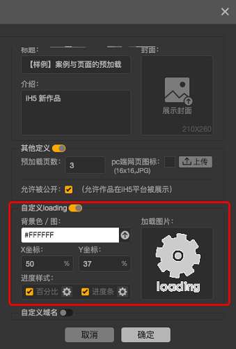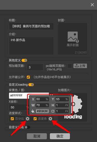 填写预加载页数(N)后,案例会先加载完前N页,之后再进入首页。加载的进度,就是案例加载的进度,可以在“发布”的面板设置进度显示的样式: