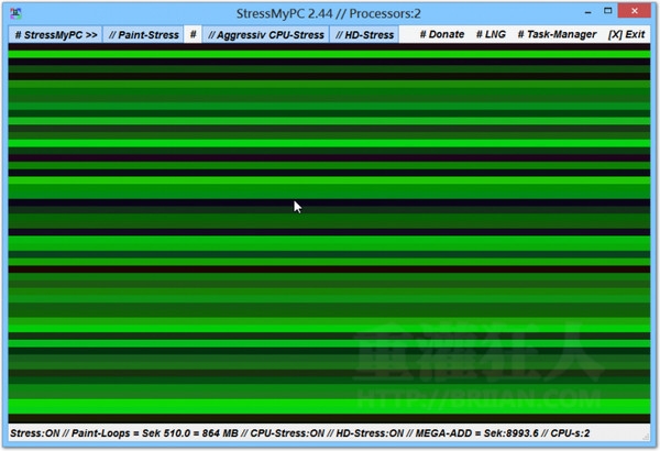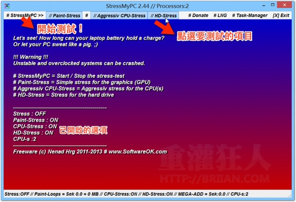 第2步:先点视窗上方的选项,选择要测试的项目。画面下方有显示“ON”的话,表示该测试会被执行。要开始测试的话,请按一下左上角的“StressMyPC”即可开始。
