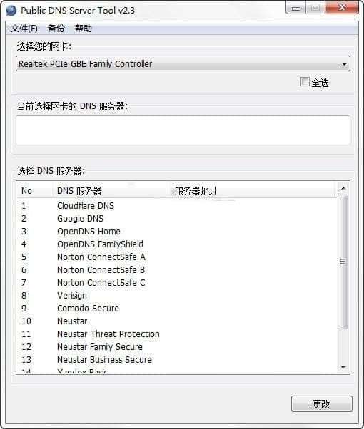 您可以使用 Public DNS Server Tool 快速切换到预设的一对公共 DNS 服务器。目前它有 16 个预置的DNS服务器对: