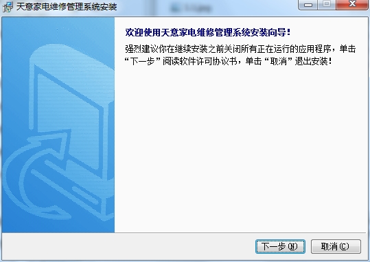 1、在PC下载网下载天意家电维修管理系统最新版压缩包,然后进行解压,解压后,双击exe程序,进入安装界面,然后点击下一步