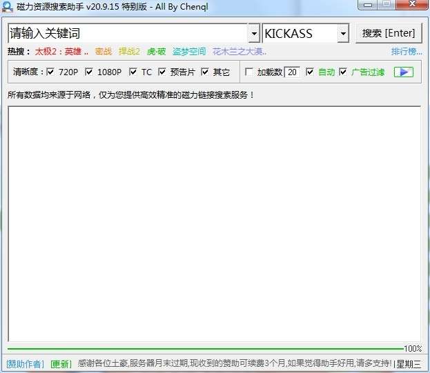 磁力资源检索小助手是一款翠绿色完全免费,简易好用的BT种子种子搜索神器。它是一款强劲的影片资源搜索器,适用对多种結果的过虑便捷挑选,搜索資源丰富多彩精确。出示检索历史数据,还可以把百度搜索加上到网址收藏夹便捷今后查看,绿色免安装,无广告无插件,解压即用,非常方便,影视BT种子搜索神器,有需求的用户请下载体验。