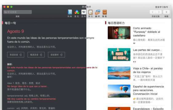 西语助手是一款极具权威的西班牙语词典软件,是西语学习者必备的工具,软件支持学习笔记、生词本多平台同步,让您可以随时学习西班牙语。