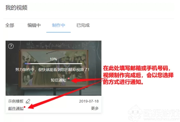 对于有些视频,可能会花费一段时间才能制作完成。你可以点击“短信通知”或“邮件通知”,然后输入你的电子邮箱地址,一旦视频创建完成,右糖以你选择的方式进行通知。