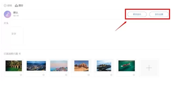 4.如果你不喜欢模板自带的背景音乐,请点击页面右侧,选择“更改音乐”点击“上传”按钮,上传自己喜欢的音乐,并勾选该音乐,点击“确定”,就可以将其用做视频背景音乐;