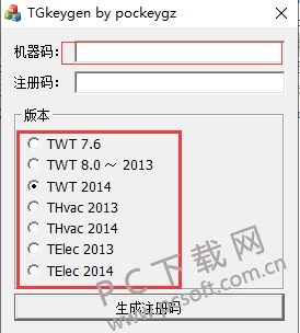2、需要您自行下载天正建筑2014破解文件,下载完成后双击.exe文件打开破解文件,我们将复制的ID号粘贴到机器码中,然后在界面下方选择“TWT2014”版本,然后点击生成注册码。