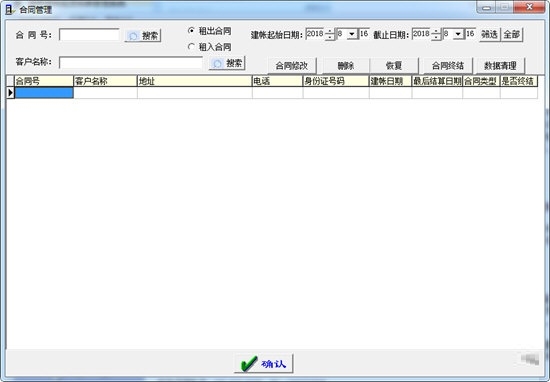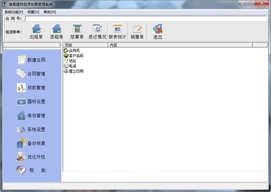 主要功能:器材设置(支持多种价格套系,增强版支持支持批量修改)、合同管理、出租、退租单录入、结算管理(可计算某月、某时间段或全部租期内租金,结算单可按品名或规格进行在租数量累计、倒扣或直列方式计算租金)、退还情况及丢失管理、杂费管理、收款管理、假期报停、打印数据导出(可导出到Excel以便用户重新排版灵活设置或发送给承租单位进行对账),可进行销售单据计算打印,租赁结算单和销售单打印时可显示大小写。