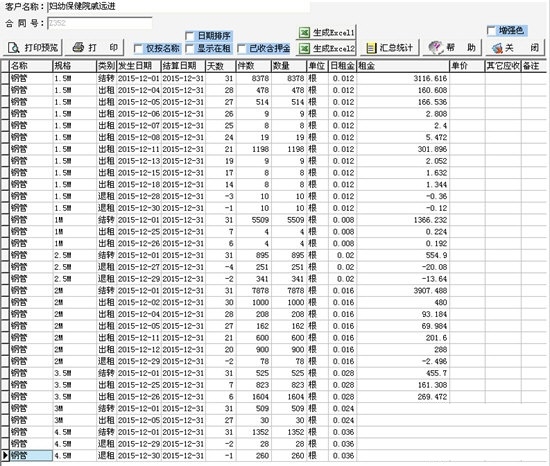 主要功能优势:可在结算单中同时显示本期租费和累计欠款。假期报停在假期跨月时,如从1月25日到2月15日的假期,对分期结算的1月份结算单和2月份结算单均能准确算出不同月份的假期报停费。Excel导出不论系统内是否安装Excel或安装是否完整,即便只安装Wps也可成功导出,可用任何版本Excel或WPS打开。单据录入时,可通过下拉框选择编号或直接输入编号后自动调出已设置好的内容。熟练后也可直接输入编号,与前期只能在众多规格中选择录入相比可大大提高工作效率。支持合同执行期间对日租金进行调整,前后不同时间段可使用不同价格。界面简洁,简便、实用、功能强大。软件可根据用户习惯自动记忆,通过选项组合,从各种租金报表类型中选取后,可暂时固定,不必每次都从众多菜单中选择,让复杂变简单。