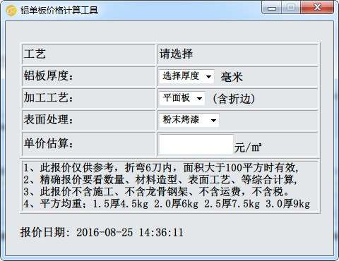铝单板价格计算工具是一款计算铝价格的软件,铝单板价格计算工具支持计算铝单板厚度、加工工艺、表面处理的价格。适用于铝单板厂家、铝单板批发销售员、建材采购商以及装饰公司。软件永久免费,使用时只需要选择自己所需要的规格,系统自动计算出铝单板的各种价格。