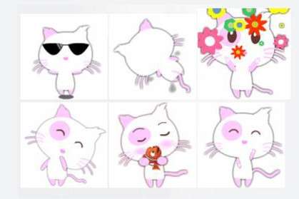 一个蓝耳朵、白脸超萌的小猫,表情有:作揖、88、踩、睡觉、打盹、变出鱼、变出心、被组装出来、笑、无奈、怒、飞吻、疑问、写字、开枪、哭、伸大拇指、转圈、窃笑。