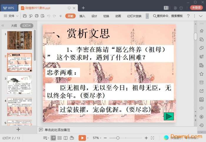 陈情表ppt课件学习这篇孝道文章起到非常不错的效果。课件加入了很多的拓展,帮助学生来思考,让学生们体会文中的含义。如果你需要这款软件那就来体验吧!