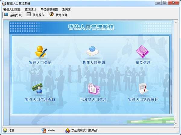 暂住人口管理系统最新版是款非常优秀且又相当出色的人口管理工具,暂住人口管理系统正式版是集单位信息设置、暂住人口登记、暂住人口注销等功能于一体的人口管理软件,暂住人口管理系统用途十分广泛,主要适用于公安局派出所、街道办、村委会、居委会、社区以及外来务工人员管理的单位使用。