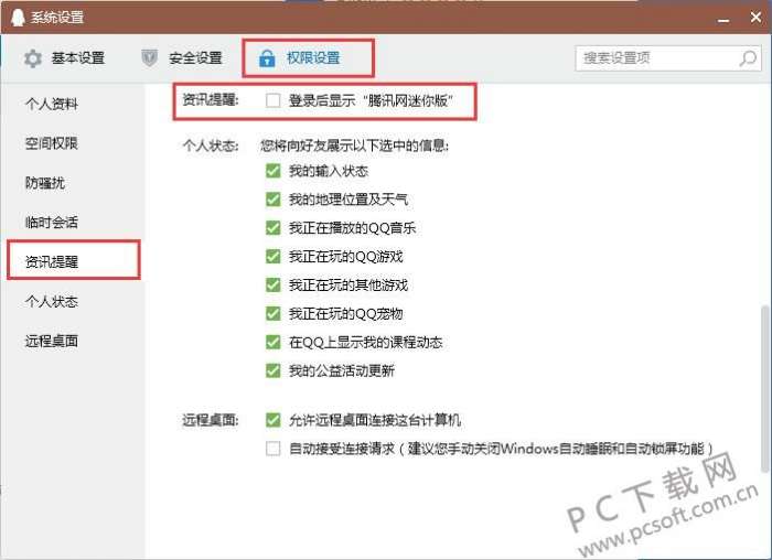 2、在弹出的“系统设置”里,先点击上方的“权限设置”选项,然后再点击左边栏目的“咨询提醒”,最后用鼠标滚轮滚至下方,看见如图所示。把“登录后显示“腾讯网迷你版””的前方√去掉就可以了。