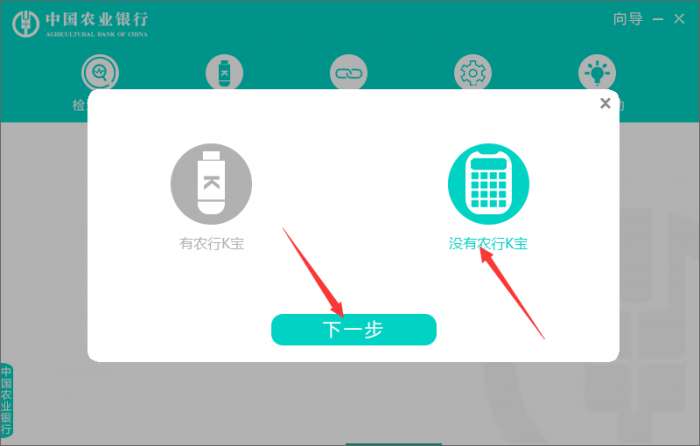 网银助手在首次使用前,需要您配合完成初始设置:如果您持有我行K宝请选择【有农行K宝】 按钮,如果您持有K令等其它认证工具请选择【没有农行K宝】按钮