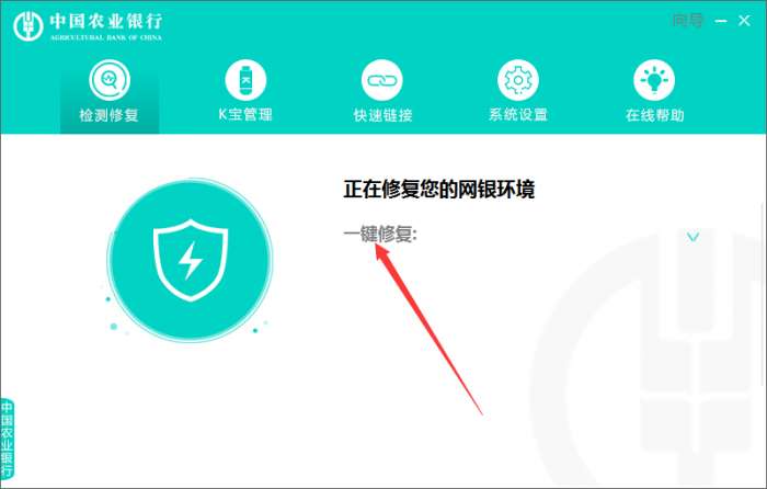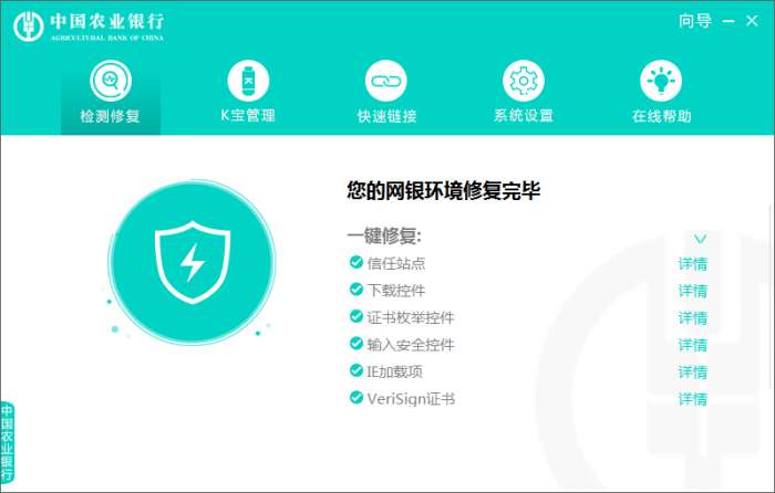 “一键修复后,网银助手就为您做好了登录网银的一切准备,您可以通过【快速链接】,选择您需要的网上银行服务