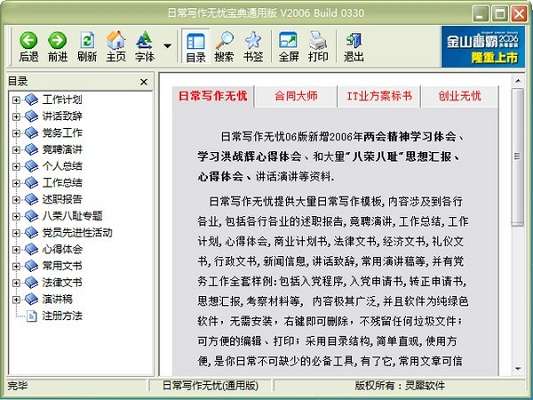 提供大量日常写作模板,内容涉及到各行各业,包括各行各业的述职报告,竞聘演讲,工作总结,工作计划,心得体会,商业计划书,法律文书,经济文书,礼仪文书,行政文书,新闻信息,讲话致辞,常用演讲稿等,并有党务工作全套样例:包括入党程序,入党申请书,转正申请书,思想汇报,考察材料等, 内容极其广泛,并可方便的复制、粘贴、打印,是你日常写作不可缺少的必备工具,有了它,常用文章可信手拈来,可以节省出大量时间做你想做的事了.软件分为通用版,教育版和学生版三个版本,你可以根据自己需要各取所需.