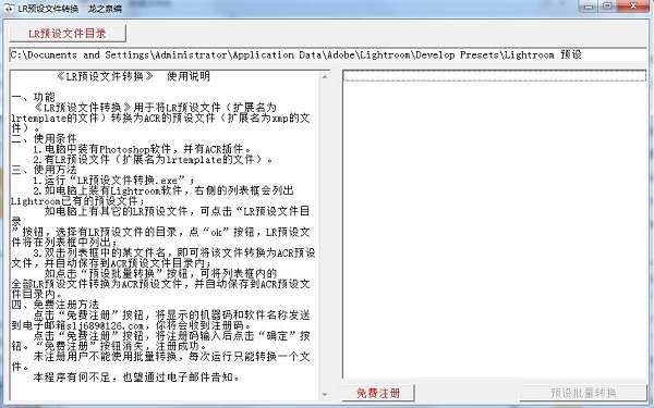 LR预设文件转换器官方版是一款简单便捷的文件格式转换软件,LR预设文件转换器中文版可将LR预设文件转换成为ACR预设文件,可以对ACR的图像处理能力进行加强,LR预设文件转换器官方版可以对批量转换的文件进行快捷的删除,并且还可以自定义的选择您需要使用的文件夹。