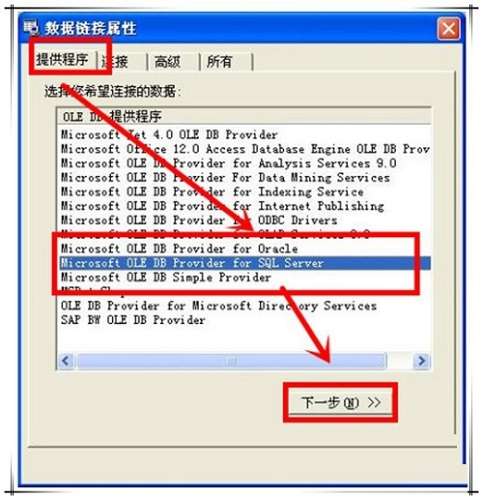 在打开的“数据链接属性”中,根据要连接的数据库类型,选择相应的数据库连接驱动程序。如要直接连接access数据库,就选择“Jet 4.0 OLE db Provider”,连接SQL server数据库,就选择“OLE DB Provider for SQL Server”,如果是oracle数据库,就选择“OLE DB Provider for SQL Server”(这个如果没有,需单独进行驱动安装)。这里连接SQL Server数据库,如下图所示选择,点击“下一步”