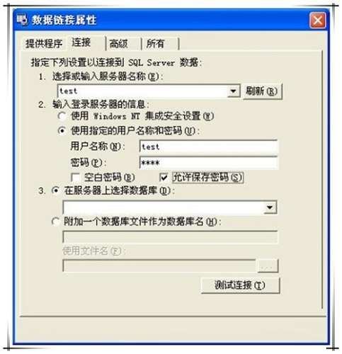 在“连接”选项卡中,服务器名称中:输入要连接的服务器名或IP地址,选择使用“指定的用户名称和密码”进行登录,然后分别在文本框中输入用户名和密码,并选择中“允许保存密码”,如果前面信息正常,那么点击下面“测试连接”就会提示“连接正常”,并且“3.在服务器上选择数据库”的下拉库中也能正常访问到数据库对象。