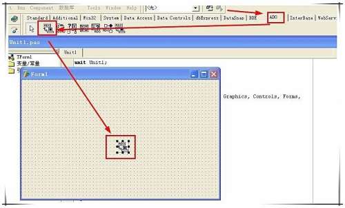 在工具栏中,切换到“ADO”选择卡,找到“ADOConnection”组件图标,双击添加到Form窗体中。
