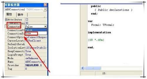 然后在对象检查器中(又称属性面板),将ADOConnection1的connected属性修改成“true”,delphi就成功与数据库建立起连接了,然后再利用ADODataSet、ADOTable等控制来操作数据库了。