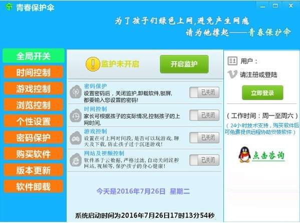 青春保护伞是一款为广大家长研发的学生上网控制软件,也可称为家长控制软件,软件可有效阻止未成年人浏览不健康网站,避免未成年人被网络上的**、暴力、等内容所侵蚀,青春保护伞也可有效限制孩子的上网时间,限制聊天,限制游戏等,可避免孩子过度沉迷网络!