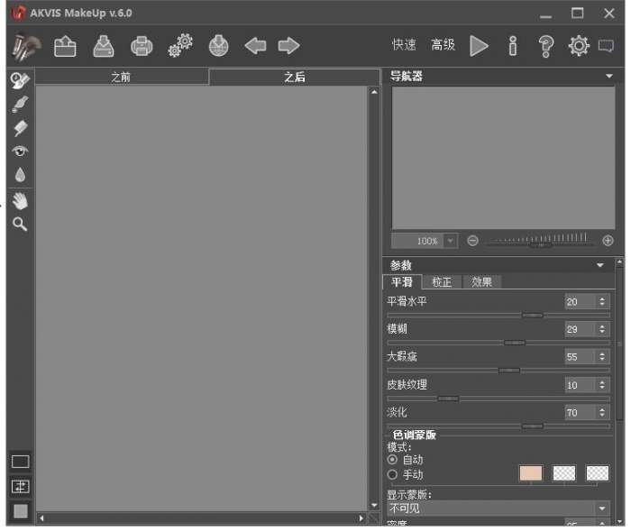 只需打开一个AKVIS MakeUp,点击运行按钮,该软件将修复和梳洗的皮肤不改变照片的其他方面,有两种模式:快速和高级。