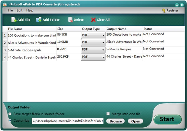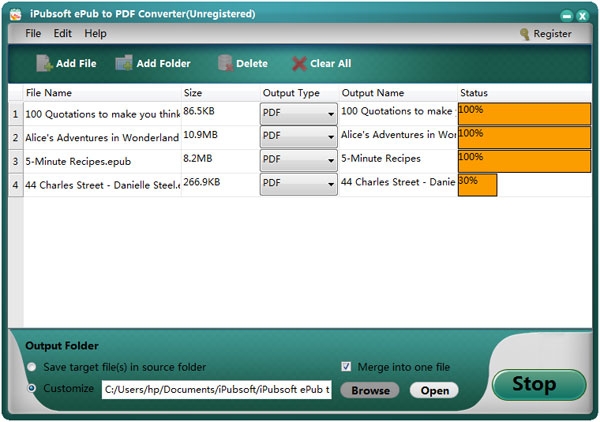 您可以单击“开始”按钮,让这个Windows应用程序开始ePub到PDF的转换。在转换之前,您可以转到程序的下部,单击“输出文件夹”栏旁边的“浏览”按钮,以指定用于保存转换文件的输出文件夹。