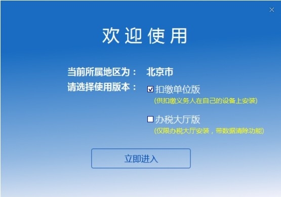 点击安装完成界面上的【立即体验】(或点击桌面“自然人电子税务局(扣缴端)”快捷方式),进入版本选择界面。除了在办税大厅终端上部署的客户端选择“办税大厅版”外,其他均选择默认选项,即“扣缴单位版”。