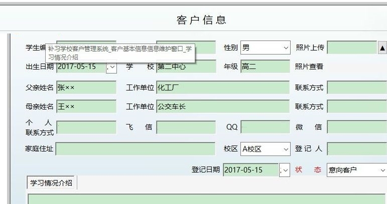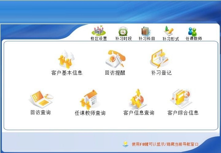 5、客户可以说是信息、回访提醒、补习登记、回访查询、任课教师查询、客户信息查询、客户综合信息等功能。