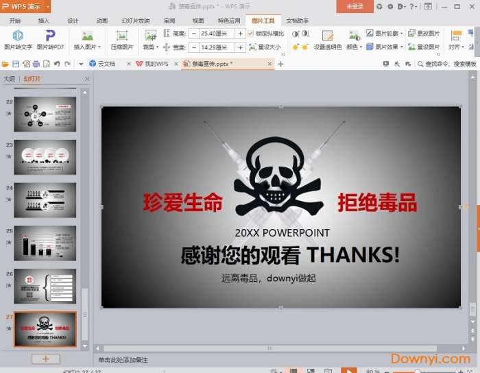 ppt整体呈灰白调,就是提醒人大家需要警醒,不能够沾上毒品,幻灯片总共有27张,使用了黑色渐变、骷髅头、注射器等元素作为背景图片。两侧填写珍爱生命拒绝毒品ppt标题。界面设计有些恐怖,能够让人对毒品产生恐惧感、可怕感。