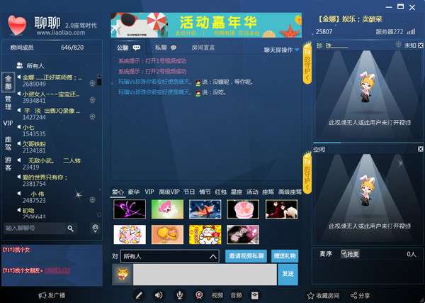 4.房间可以由房主修改房间宣言。所有房间都有语音视频功能,包含一对多的广播式视频和2人私聊视频,图像清晰稳。
