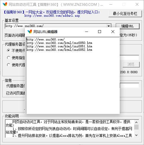 网站自动访问工具可以按照自己指定的访问列表,指定的时间间隔来访问某些网站,如果你的机器安装了alexa工具条也可以提高你的网站在alexa上的排名.