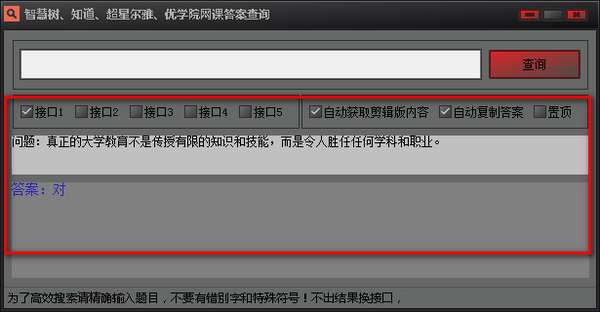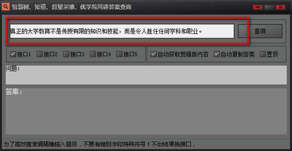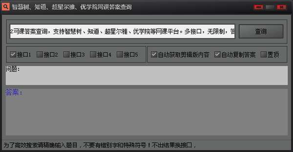 网课答案查询最新版是一款十分优秀的院网课答案查询工具,网课答案查询最新版体积小巧,功能强大,能够帮助大家轻松快捷的查询智慧树、知到、超星尔雅、优学院等网课平台老师发布的作业的答案,不仅如此,网课答案查询官方版的使用方法也非常的简单,只需要复制这些作业的题目,答案就会自动显示。