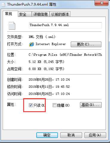 3、找到ThunderPush.7.9.44.xml后,以记事本打开进行编辑删除里面的所有内容,然后保存退出。然后点击鼠标右键在在弹出的选项中点击【属性】,在打开的属性窗口中勾选【只读】最后点击【确定】就可以。
