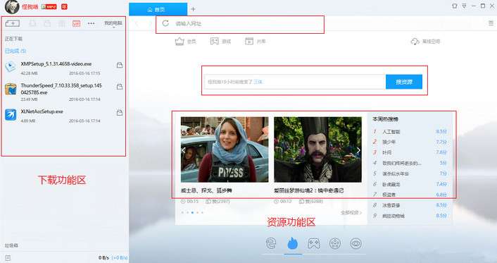 迅雷7:此版本的下载功能按钮分散在页面左右两侧,与迅雷9的功能排版有所不同。迅雷7拥有高速通道和离线下载功能,可以快速下载资源。