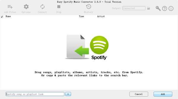 只需浏览Spotify帐户即可找到要下载的歌曲或播放列表。然后单击“添加文件”按钮将Spotify音乐添加到程序中。然后将这些歌曲、播放列表或专辑从Spotify应用程序拖动到Easy Spotify Converter的主窗口。或者,也可以复制Spotify歌曲/播放列表的URL链接,并将其粘贴到主界面底部的搜索框中。