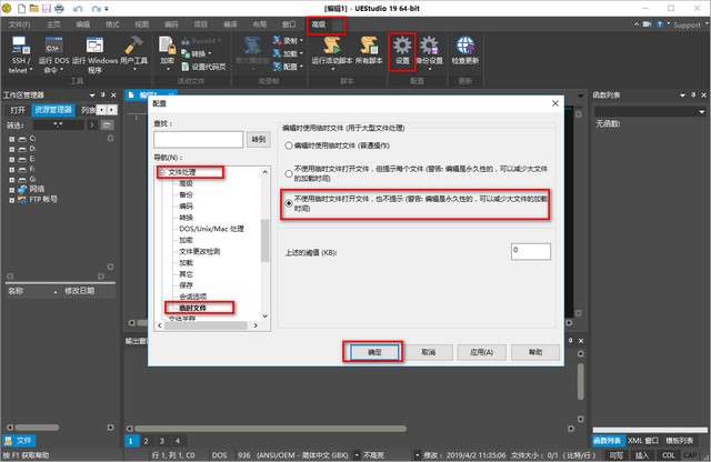 2、左侧导航依次点击文件处理--临时文件,右侧点击“不使用临时文件打开文件,也不提示”,点击确定即可。