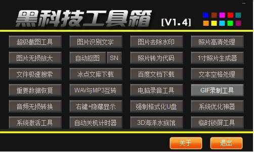 黑科技工具箱官方版是一款功能齐全的专业化工具箱软件,黑科技工具箱中文版提供了截图工具、图片去水印、照片转代码、图片放大、系统激活等各种强悍功能,黑科技工具箱官方版支持GIF录制功能,将你的视频或者是桌面的操作录制为GIF,支持系统优化工具,可以对你的电脑体检,可以找到垃圾。