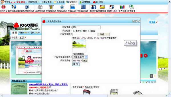 在定制设计面板,点击“网站头设计”按钮,系统自动弹出网站头设计窗口,如下: