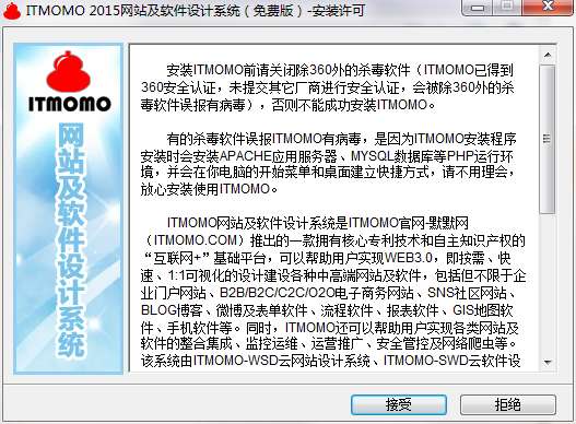 安装ITMOMO前请关闭除360外的杀毒软件(ITMOMO已得到360安全认证,未提交其它厂商进行安全认证,会被除360外的杀毒软件误报有病毒),否则不能成功安装ITMOMO。有的杀毒软件误报ITMOMO有病毒,是因为ITMOMO安装程序安装时会安装APACHE应用服务器、MYSQL数据库等PHP运行环境,并会在你电脑的开始菜单和桌面建立快捷方式,请不用理会,放心安装使用ITMOMO。