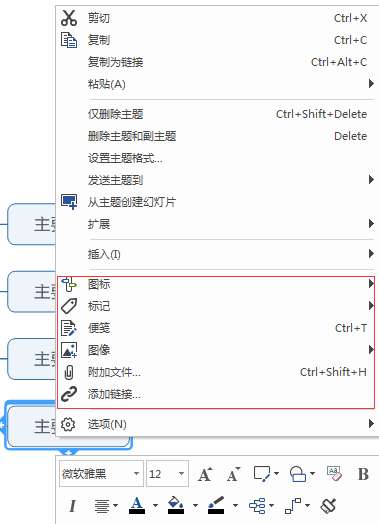 4、如果您要添加图标,超链接,您可以右键主题,在弹出的选项中,选择您要功能就可以了。