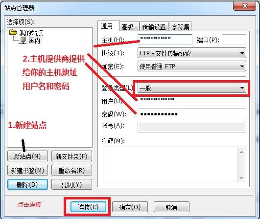 先双击打开软件,点击站点管理-新建站点-把空间提供商或者你自己创建的FTP的主机名,用户名,密码输入上去,并且点击连接即可进入【默认保存密码下次直接点击连接即可】,进入后左边是本地目录和文件列表,右边为FTP的目录文件列表,你把FTP看作自己的U盘一样管理即可,FTP上,选中文件拖动到...的目录可以把文件移动上一层,拖动相应的文件名为移动到相应目录,一般主机目录如图所示,db是给你传压缩包和下载压缩包的,log是日志文件存储地方,有的主机不提供日志,web就是你的web空间了,一般路径为/xx/web/,其中xx代表你的用户名。